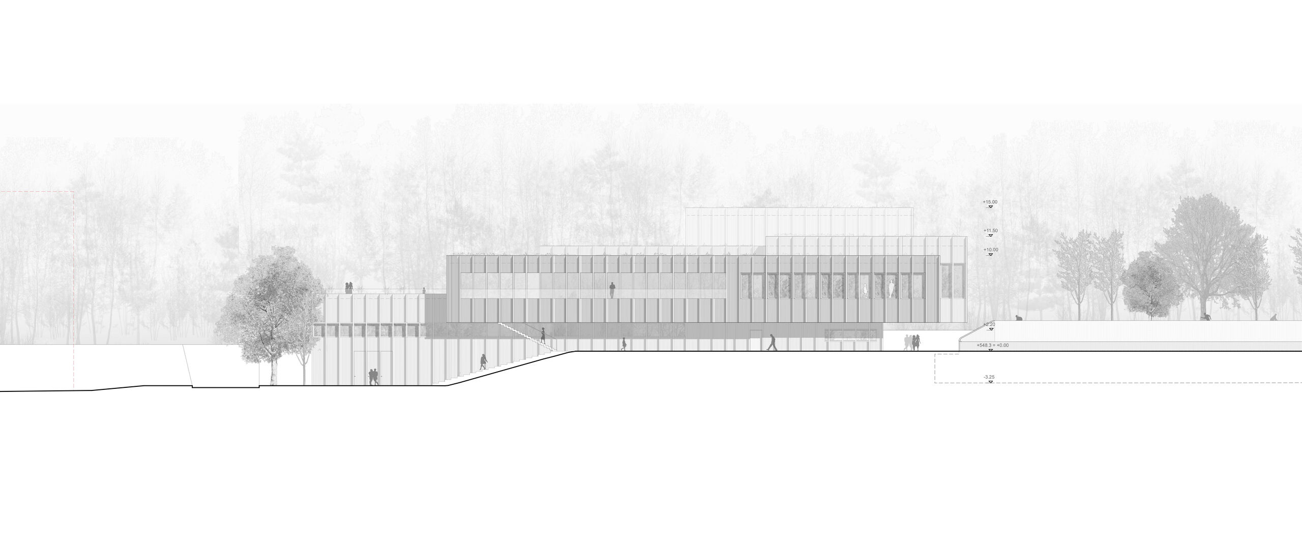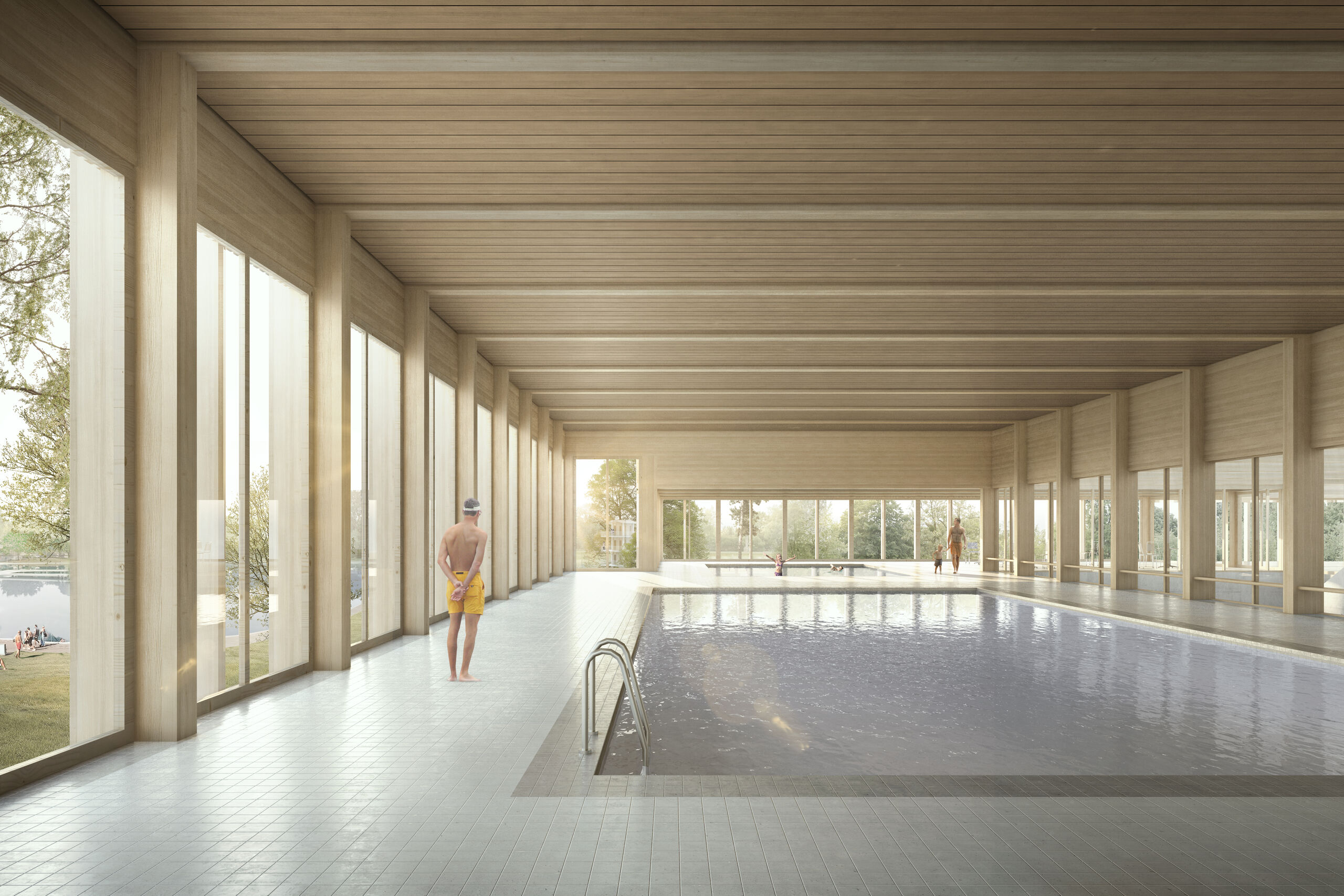 At the node between Stöckackerstrasse and the old Murtenstrasse, the required spaces were combined in such a way that they occupy the smallest possible area and the various uses benefit from the short distances. Due to the different room heights of the individual halls, a building was created that is composed of several pavilion-like bodies, thus playfully structuring the large volume. This results in a flattening from the street to the outdoor pool, so that the building seems to merge with the park. From the swimming hall on the upper floor, the view opens out over the hilly landscape and the open-air pool.